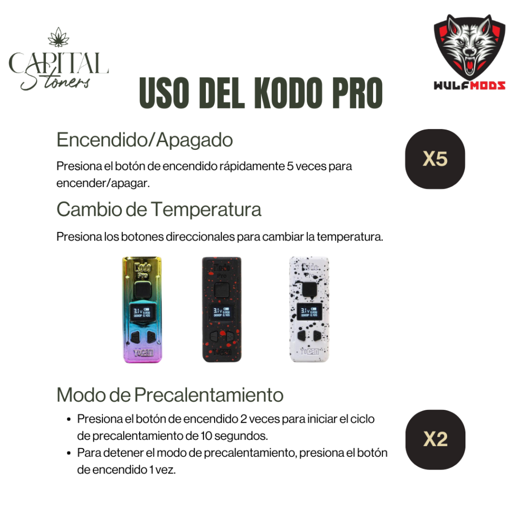 El Wulf Mods KODO Pro Cartridge Vaporizer es un vaporizador compacto y potente diseñado para cartuchos de aceite 510. Con una batería de 400mAh, voltaje ajustable (1.8V-4.2V), precalentamiento de 10 segundos y una pantalla OLED, ofrece control total y una experiencia de vapeo personalizada.  Ideal para vapeadores de todos los niveles que buscan calidad y estilo en cada calada.